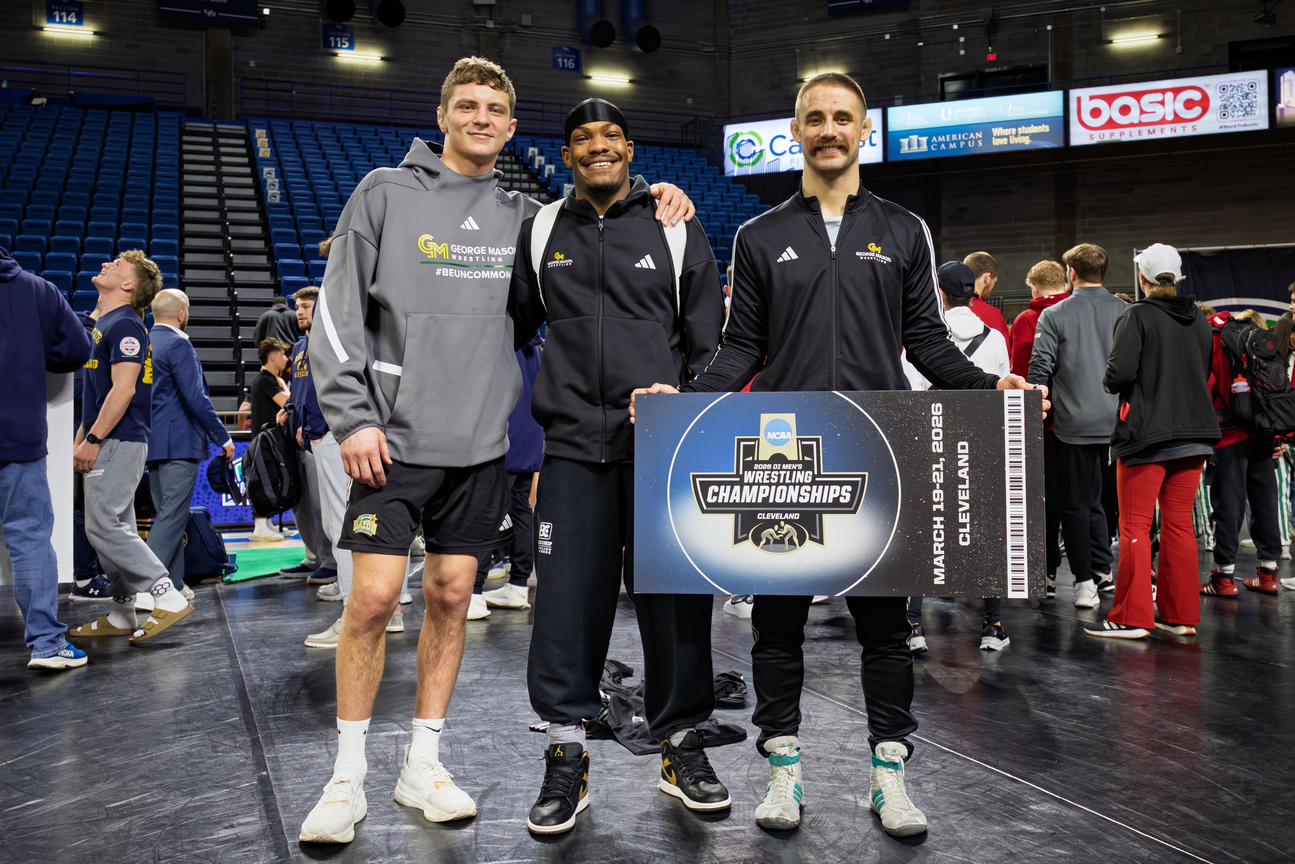 🔼 Moving On. Three George Mason wrestlers qualified for the NCAA Championships! Logan Messer won his first MAC Championship, while Malachi DuVall and DJ McGee earned second and third-place finishes, respectively.